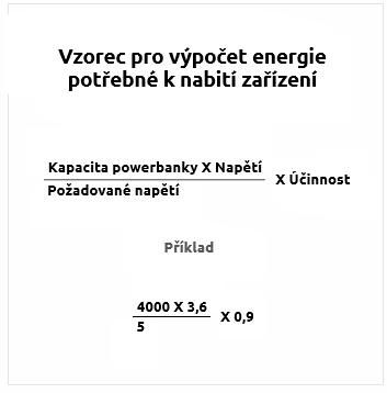 Zaprvé doporučujeme, abyste zjistili kapacitu zařízení. Informaci naleznete na zadní straně zařízení, přímo na baterii vašeho zařízení nebo v návodu k použití. Informace o kapacitě baterie v PowerBank je však většinou uváděna při napětí 3,6V - 3,7V. Pro napájení mobilních telefonů a jiných zařízení je třeba napětí 5V, proto je kapacitu POWERBANK třeba přepočítat.