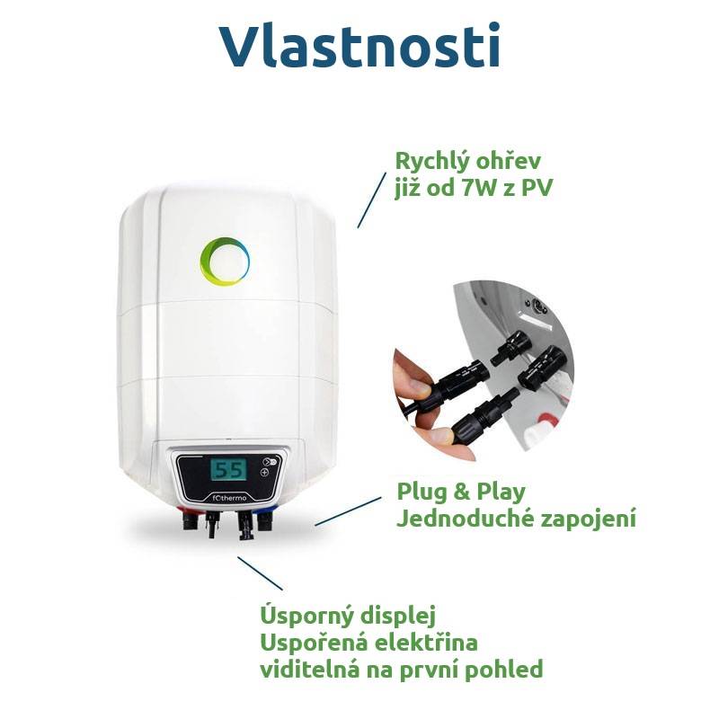 Fotovoltaický systém sestávající z 10litrové akumulační nádrže, solárního panelu o výkonu 435 Wp, 10 m kabeláže, rozvodné skříně, pojistkových odpojovačů a pojistek. Vše, co potřebujete k připojení a zahájení ohřevu vody ze slunce, budete mít k dispozici.