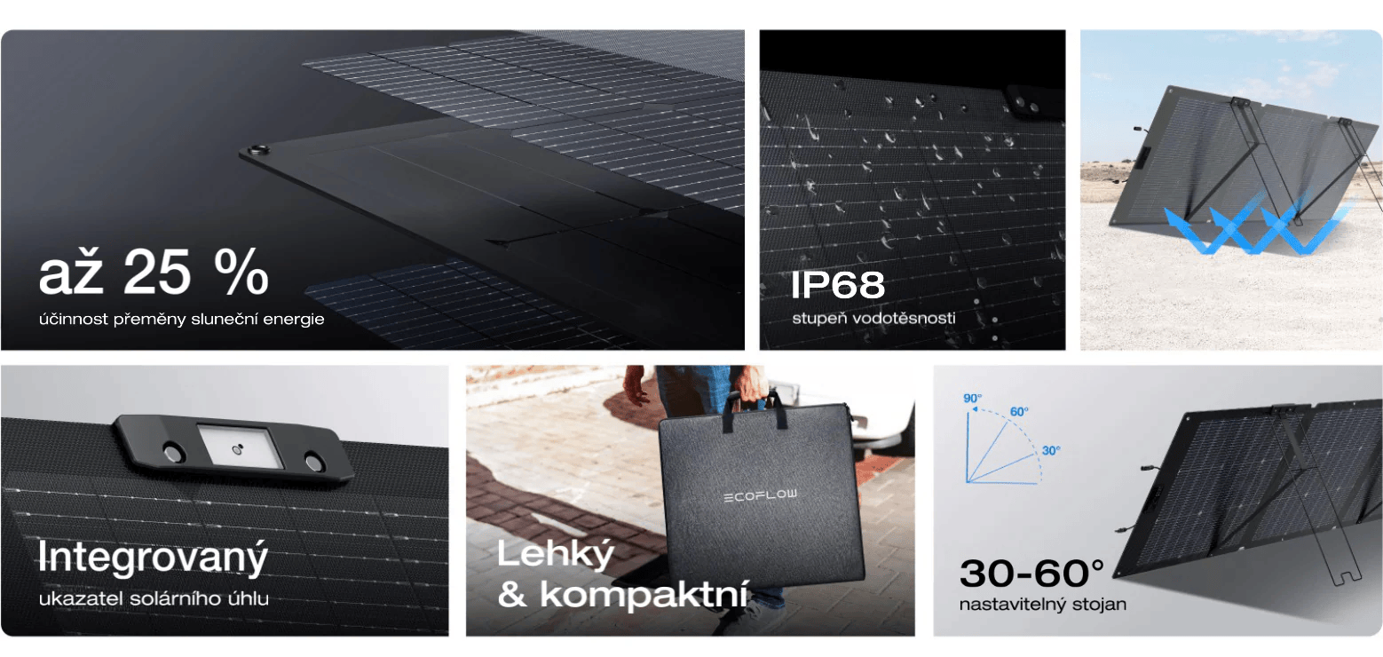 Skládací solární panel EcoFlow 160W 2. generace přináší vyšší účinnost solárních článků ve srovnání s předchozí generací a možnost získat více energie ze slunečního záření díky vestavěnému indikátoru úhlu slunce a integrovanému stojanu, který umožňuje naklonění panelu podle aktuální polohy slunce.