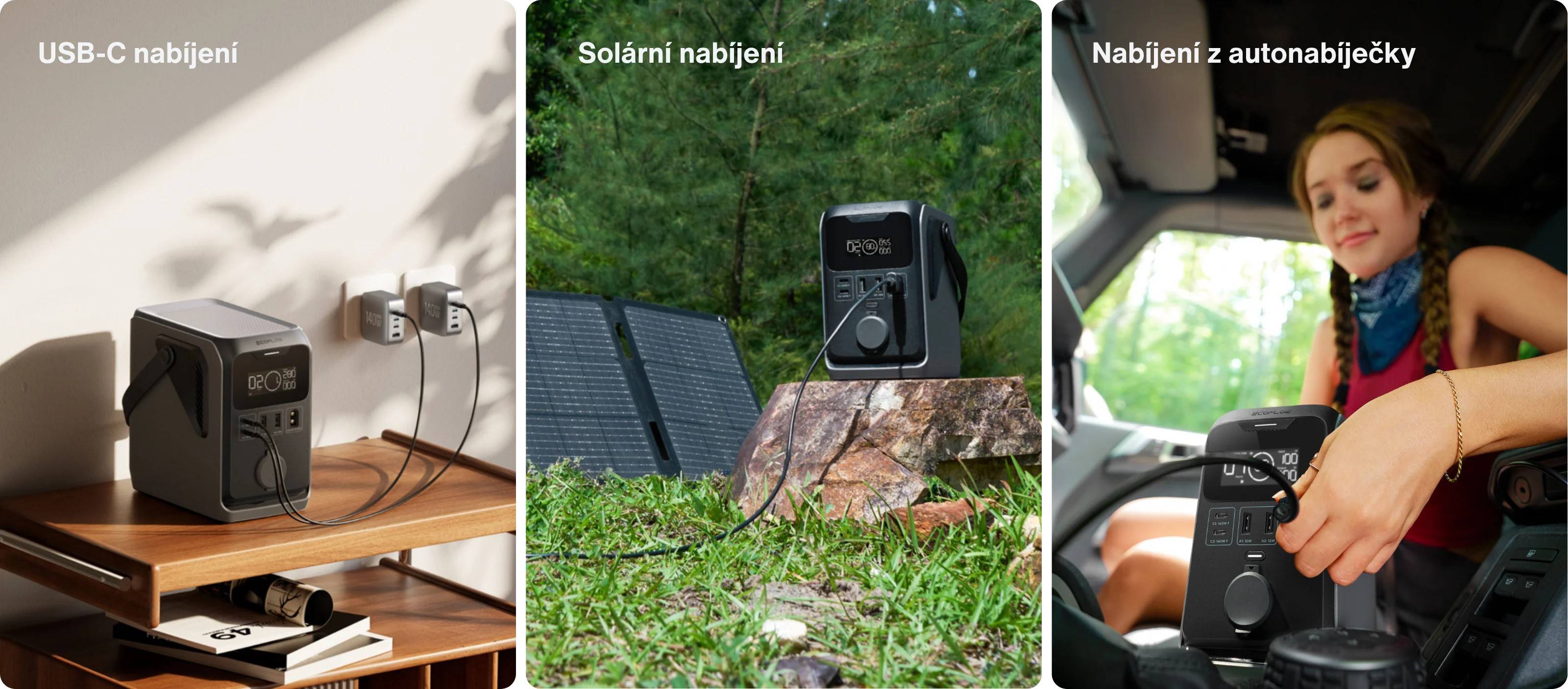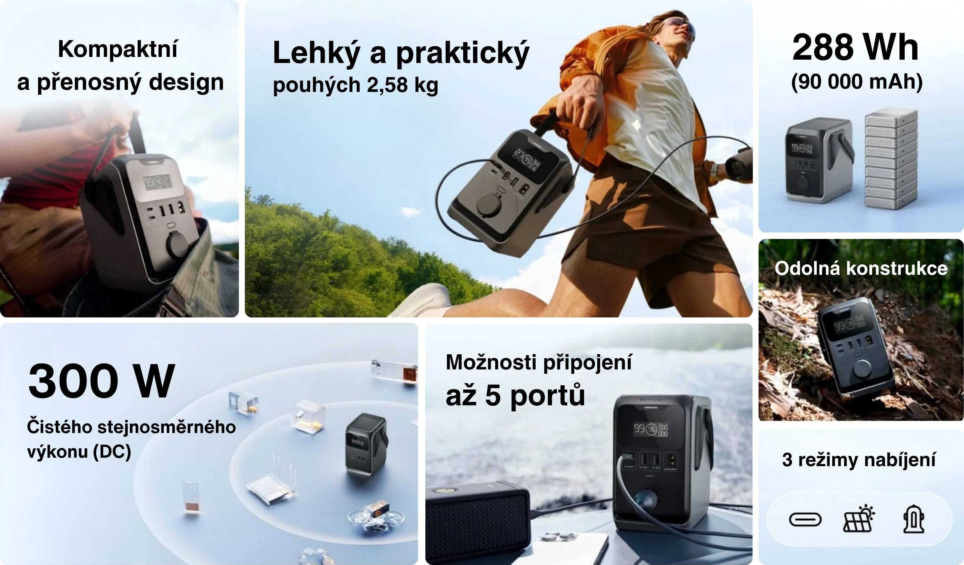 Mimořádně skladná a lehká bateriová stanice s kapacitou 288 Wh a celkovým výkonem 300 W. Je optimálním zdrojem energie pro kempování, cestování, rybaření i pro pořádání venkovních akcí. Napájet může světla, kamery, tablety, reproduktory a další zařízení. Zároveň se snadno se přenáší, má odolnou konstrukci a zásluhou velmi kompaktního designu se pohodlně vejde i do batohu. Díky několika výstupním portům a 12V zásuvce může stanice zásobovat energií i více zařízení současně. Dobíjena může být ze sítě, solárními panely i automobilovou zásuvkou.