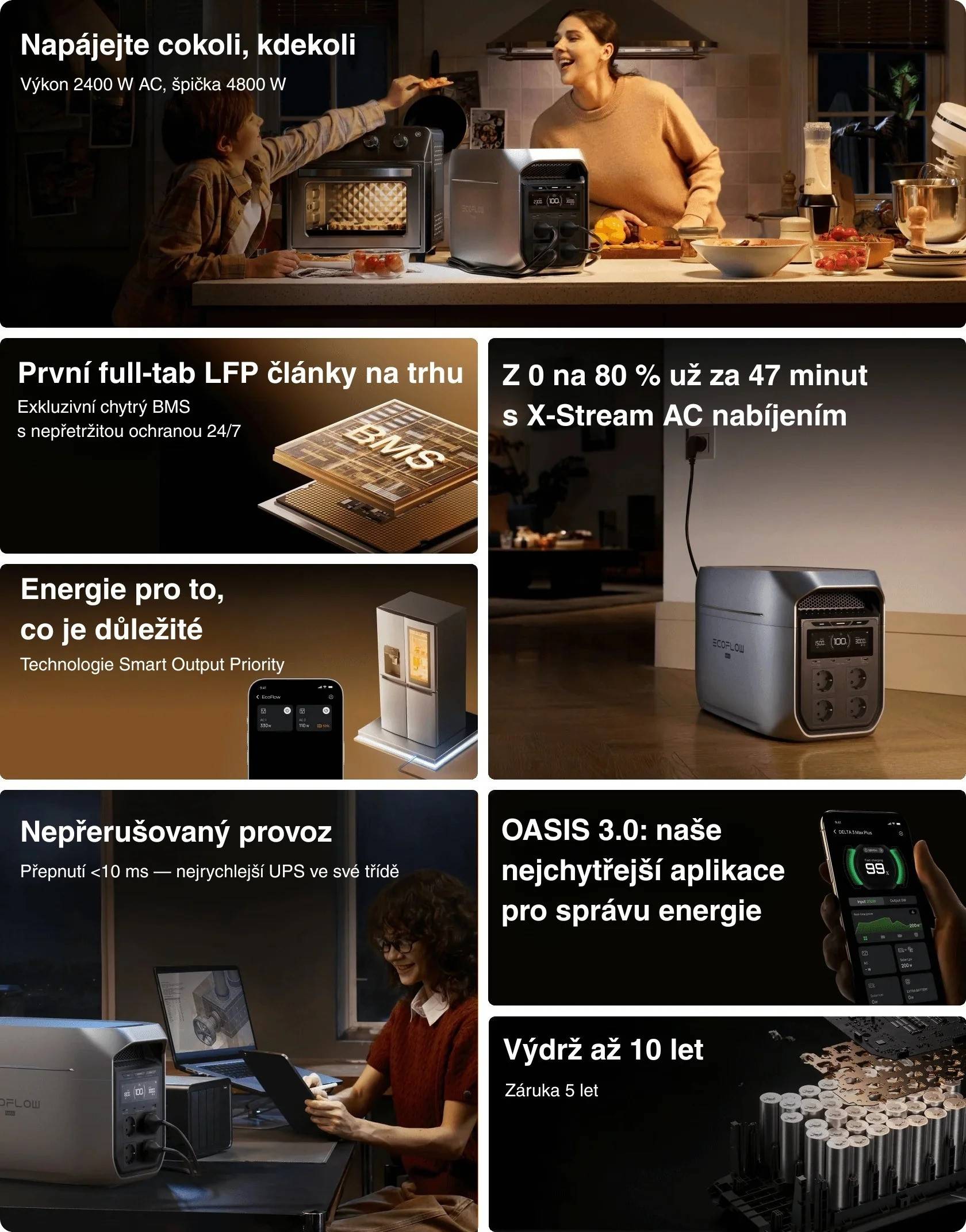 Přenosná bateriová stanice nabízí jmenovitý výkon 2 400 W a díky technologii X-Boost zvládne napájet i spotřebiče s příkonem až 3 200 W. Kapacita 2 048 Wh poskytuje dostatek energie pro většinu domácích zařízení a režim UPS s přepnutím do 10 ms zajišťuje spolehlivé nouzové napájení při výpadcích elektřiny.